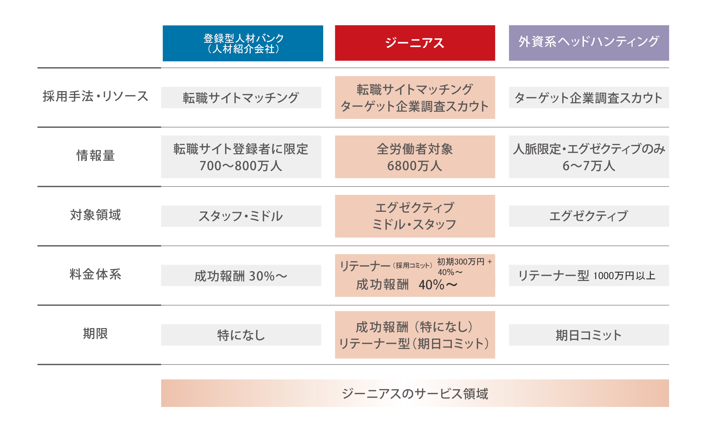 ジーニアスのサービスが他の人材紹介サービスと大きく異なる点は、経営診断・戦略提案を提供する「コンサルティングファーム」、我が国に多数存在する「登録型人材バンク」、欧米エグゼクティブサーチに代表される「外資系ヘッドハンティング」、その双方の特徴を融合した、新しいタイプの人材紹介サービスであることです。
